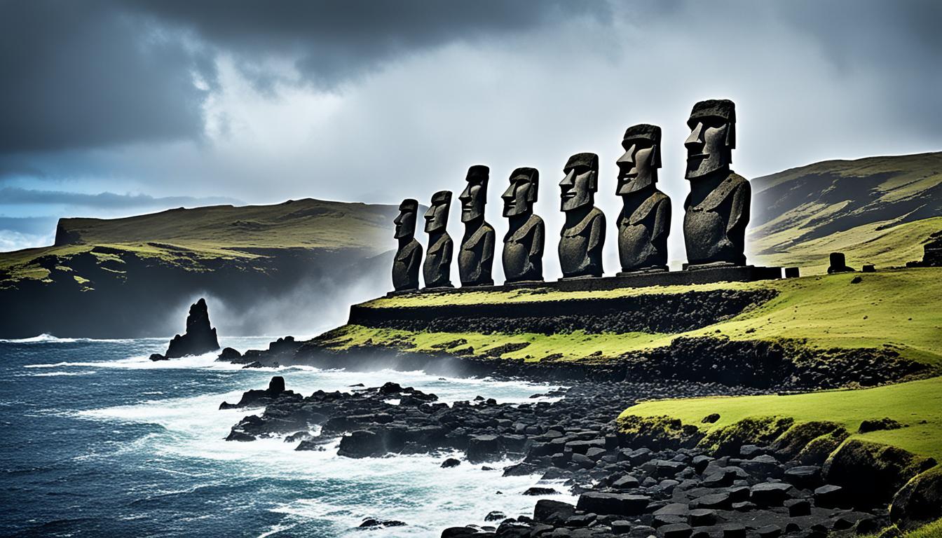The Moai statues of Rapa Nui are symbols of the island’s rich culture and history. These giant figures were carved by the Rapa Nui people long ago. They have amazed people all over the world, leading to many scientific and archaeological studies.